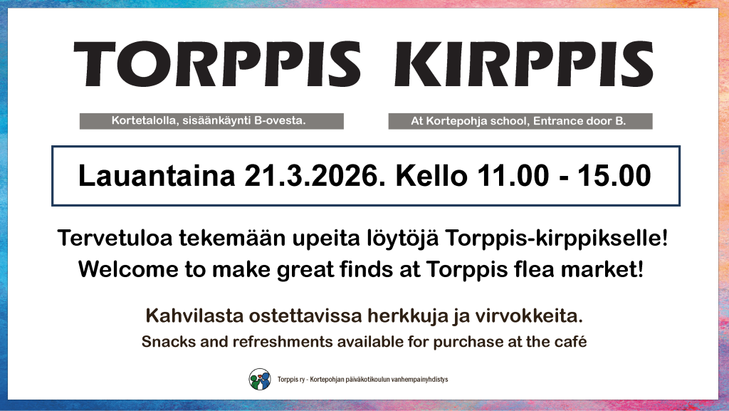 Torppis kirppis lauantaina 21.3. kello 11.00 – 15.00 Kortetalolla (Kortepohjan koulu), sisäänkäynti B-ovesta. Tervetuloa tekemään upeita löytöjä Torppis kippikelle. Kahvilasta ostettavissa herkkija ja virokkeita.